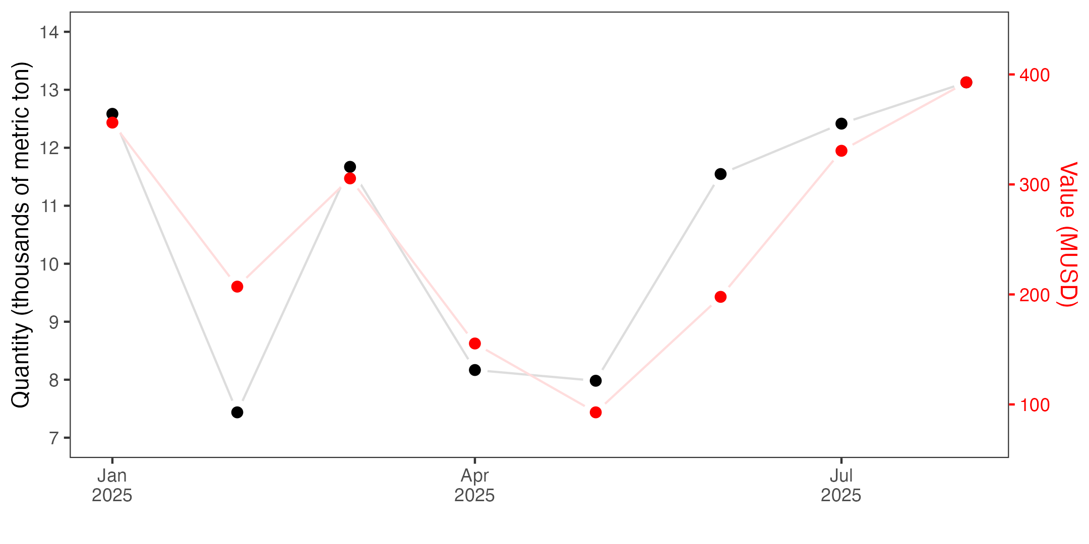 A key point of contention has been China's controls over rare earth magnets, which are indispensable components in numerous modern technologies, notably in defense and aerospace, electric vehicles, and high-tech industrial sectors. In this regard, China’s exports of rare earth magnets (under tariff code 85051110) also show a quick rebound since they bottomed out in May, with now both the volume and value exceeding the pre-control levels, as shown in the graph below.
