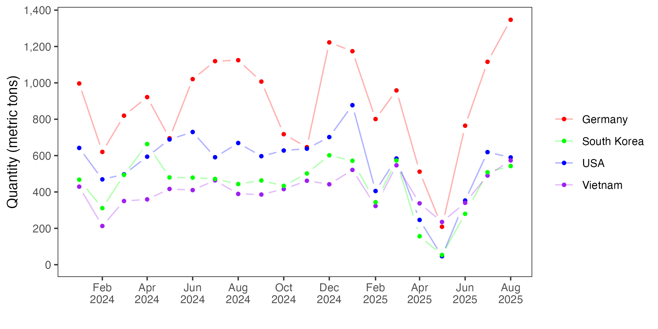 Breaking down the export flows by specific countries, China's rare earth magnet exports to key destinations, Germany, South Korea, and Vietnam, all grew in August, with the exception of the U.S., which dropped by 4.7% in volume.
