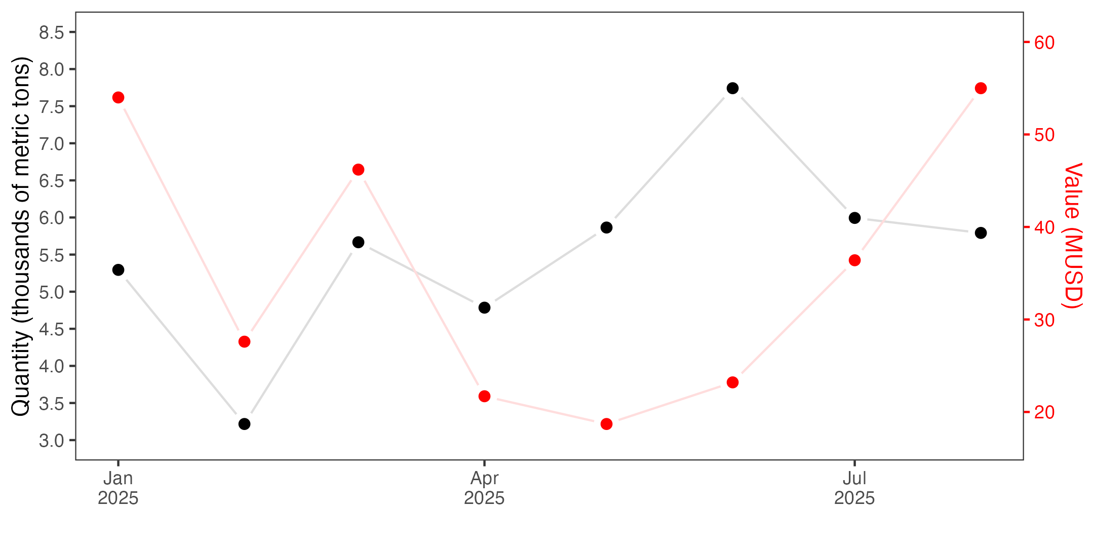 Factoring in rare earth derivative products, both the volume and value of rare earth and related product exports increased significantly in July and August, surpassing the pre-control levels. As shown in the graph below, this recovery followed a two-month slump in April and May, which was caused by the implementation of the April export control measures.