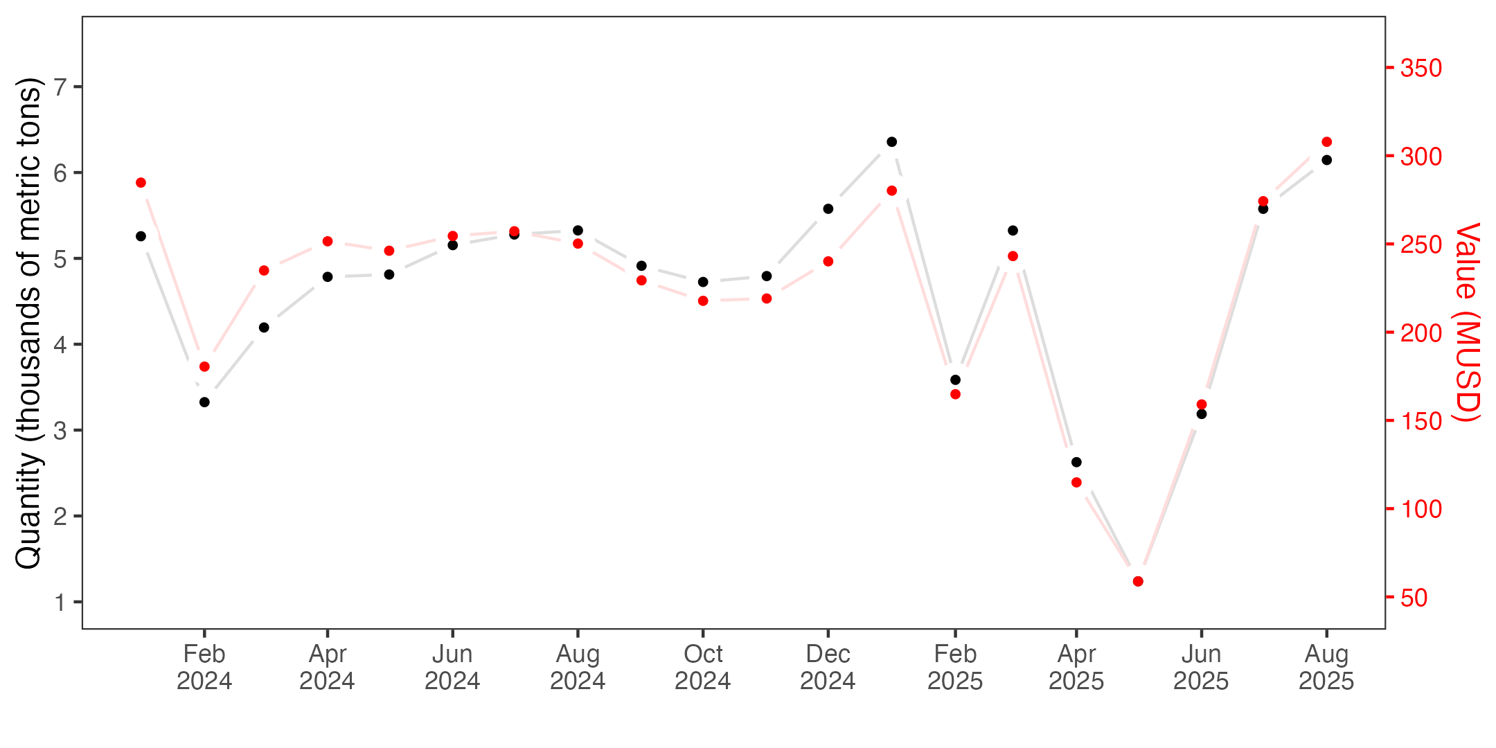 A key point of contention has been China's controls over rare earth magnets, which are indispensable components in numerous modern technologies, notably in defense and aerospace, electric vehicles, and high-tech industrial sectors. In this regard, China’s exports of rare earth magnets (under tariff code 85051110) also show a quick rebound since they bottomed out in May, with now both the volume and value exceeding the pre-control levels, as shown in the graph below.
