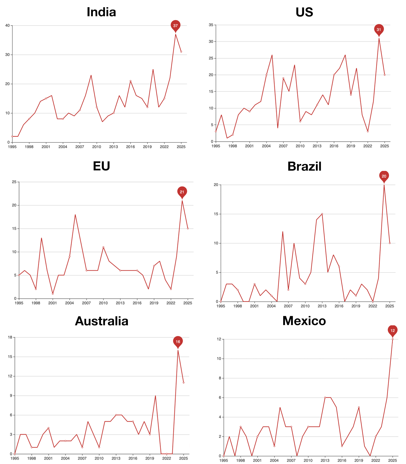 The top five economies, India, the U.S., the EU, Brazil and Australia, all hit a record high for trade remedy investigations in 2024, with a moderate decline in 2025 in some nations.