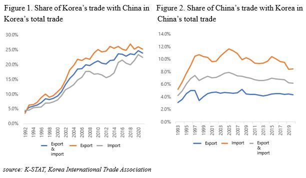 Since Korea and China established diplomatic relations in 1992, they have achieved remarkable mutual development in many areas, especially in trade. Trade volume between Korea and China was only $6.4 billion in 1992, but it increased 38 times to $241.5 billion in 2020. Especially for Korea, China has remained the largest trading partner in both import and export since 2004, occupying 24.6% of Korea’s total trade with the world in 2020, as shown in Figure 1. Although there seems to be a relatively modest increase in trade with Korea from the Chinese side (see Figure 2), Korea had emerged in 2013 as the largest exporter to China. In 2020, it was ranked as the third largest exporter to China after Japan and Taiwan.