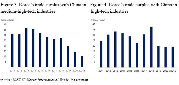 Changes in the Chinese industrial structure have led the trade between Korea and China to be more inclined to high-tech or medium-high-tech industries, less to medium-low-tech or low-tech industries. (Here, the categorization of industries was based on ISIC REV. 3 “Technology Intensity Definition” prepared by the OECD.) According to the analysis, Korea has increasingly exported high-tech items, marking 45% of Korea’s total export to China in 2020. Apart from the increased export volume of high-tech items, Korea's trade surplus with China in the high-tech industry and medium-high-tech industry has decreased by $5.2 billion and $16.8 billion from 2011 to 2020, respectively.
